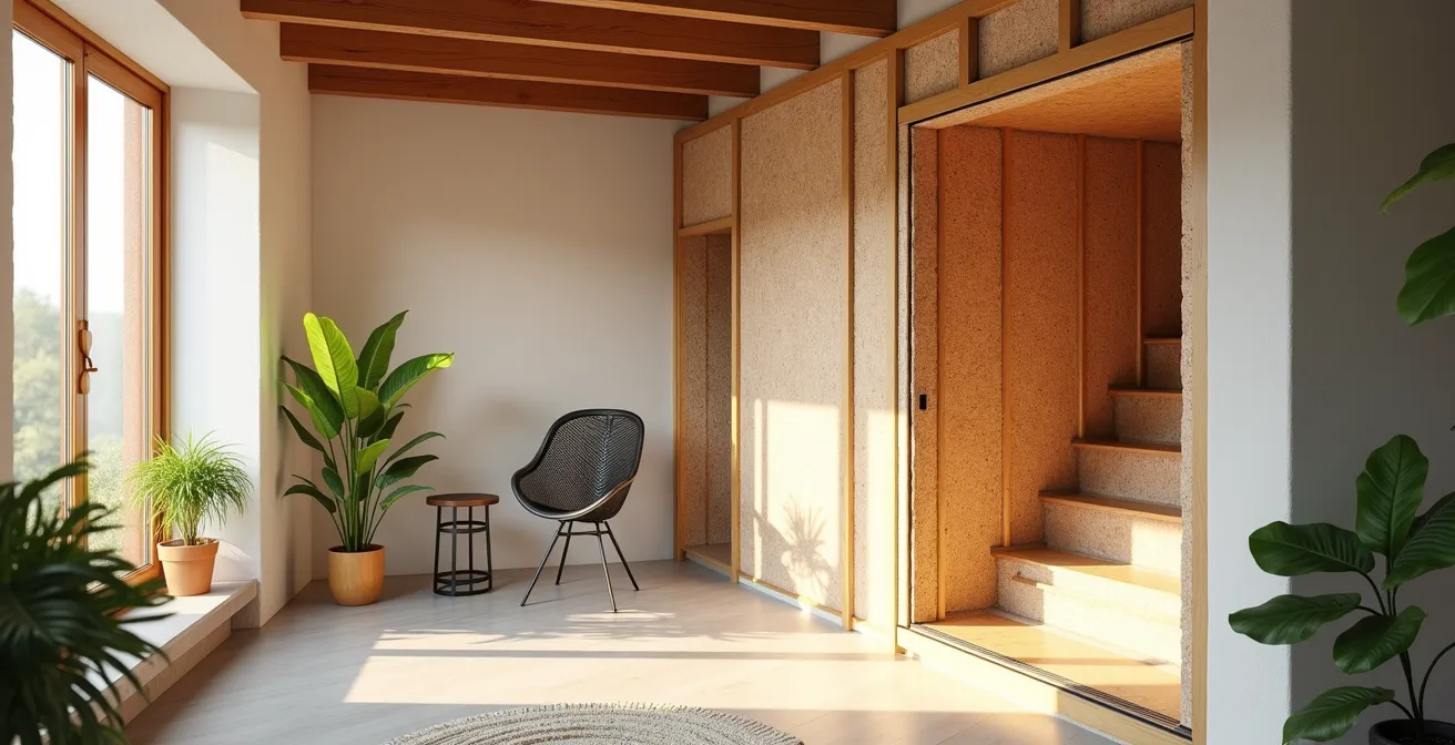 Lorsqu’on pense isolation, l’image qui vient souvent est celle de la laine de verre ou du polystyrène. Pourtant, pour une maison saine, le choix du matériau est aussi crucial que son pouvoir isolant. Les isolants biosourcés, comme la laine de bois ou le chanvre, possèdent une qualité fondamentale que les isolants synthétiques n’ont pas : la perspirance. Ils agissent comme une peau, capable de gérer l’humidité ambiante. La fibre de bois, par exemple, absorbe et restitue l’excès de vapeur d’eau sans jamais perdre ses propriétés isolantes, ce qui contribue à assainir naturellement l’air et à prévenir les risques de condensation et de moisissures.